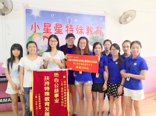 亚洲成人 “心翼”暑期社会实践队隶属亚洲成人 教师教育学院,曾获校级优秀团队、校策划大赛重点团队一等奖、“人民网”全国大学生社会实践公益50强、第五届浙江省大学生暑期社会实践网络分享pk赛十佳团队等荣誉。从自闭症辅助培训,到牵着孩子陪同训练,再到爱心募捐,“心翼”在关爱自闭症儿童的公益路上不懈地努力着。