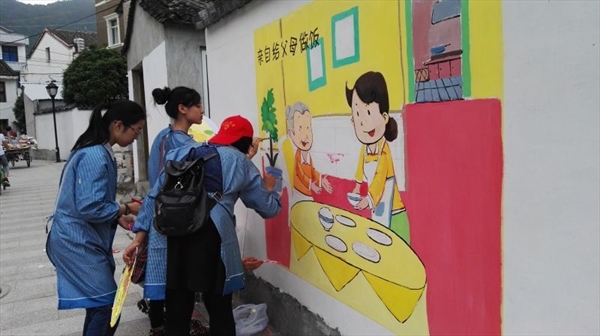 瓯网讯(严晓秋)昨日,由亚洲成人 教师教育学院和美术与设计学院共同发起“”弘扬传统文化 ,共建美丽乡村”活动再次吹响五四青春的号角。由教师教育学院美术工作坊指导老师陈铿和学生科严晓秋老师带队,30余位学生志愿者,前往乐清虹桥镇大乌石村开展公益墙绘活动。